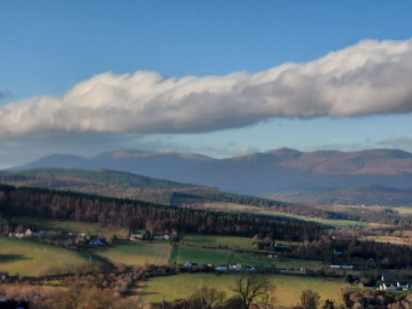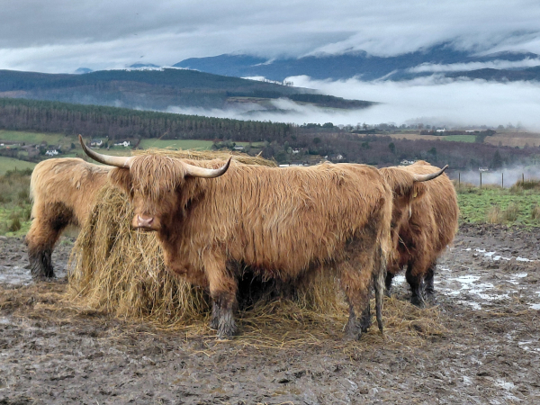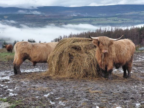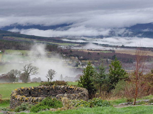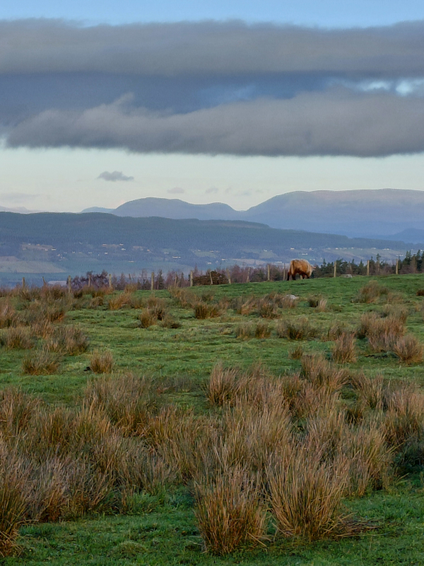 Each day I bundled up and went for a walk to catch the rapidly changing landscape as winds pushed clouds across the hills and mists rose from valleys. There were magical moments when shafts of sun broke through a cloud over a mountain and highlighted a small piece of a hill or a stand of trees. No wonder of the reverence for the ‘fair folk’ (I won’t risk calling them fairies out of respectful trepidation). First, I always stopped at the top of the hill to visit the hairy coos, the Scottish Highland cow breed, perfectly orange and color-wheel-complementary to the blues of the landscape, as their heads slowly swung their immense sideways horns to take a look at me. Like the hearty double-coated horses to the other side of us, they also were unfazed with the slant of the mucky fields and damp and wind. The farmed venison in the fields above kept their distance and I only heard tell of them.